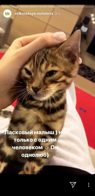 Анастасию Решетову подписчики уже на протяжении долгого времени замечают одну по вечерам. С недавнего времени девушка переехала к своему молодому человеку. И видимо, чтобы Решетова не скучала, пока Тимати находится не дома, он купил ей котенка. Она часто показывает свои игры с маленьким питомцем в квартире у Тимура. Сегодня она написала в своем профиле про котенка Тимати: «Ласковый малыш, но только с одним человеком. Так как он однолюб»