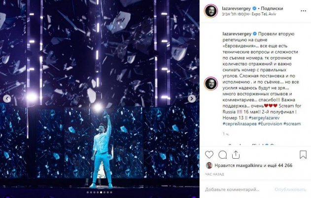 Лазарев уже пожаловался на определенные технические трудности собственного номера, которые в настоящее время пытается устранить команда певца. «Но все усилия, надеюсь, будут не зря…» - пишет артист в своем новом посте.