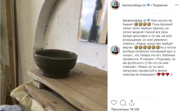 «Пока Арсений лепил свою первую тарелку, он облил жидкой глиной все свои белые кроссовки и тут же, на мое возмущение, он мне уверенно ответил: «Мама, искусство требует жертв». Ну, а потом вообще попросил гончарный круг и сказал, что теперь это его любимая профессия. Я говорю: «Подожди, ты же футболист». На что он мне отвечает: «Мама, ну ты чего, несколько профессий в жизни никогда не помешают»» –заявила довольная телеведущая.