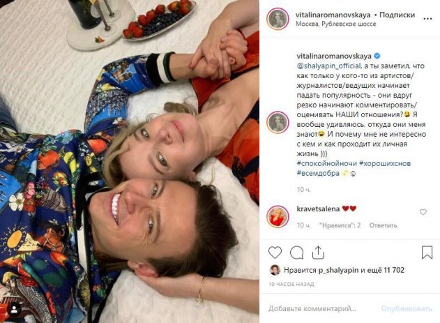 Судя по словам Виталины, юмористка может сама пиариться за счет их пары из-за того, что теряет популярность. «Я вообще удивляюсь, откуда они меня знают. И почему мне не интересно с кем и как проходит их личная жизнь», - пишет Цымбалюк-Романовская в посте. При этом возлюбленная Шаляпина очень хитро обошла прямые обвинения в сторону в сторону Воробей, хотя в последнее время только она одна из знаменитых артистов и высказывалась об их паре. Шаляпин же, хоть лайк под записью Виталины поставил, но комментировать высказывания Воробей не стал.