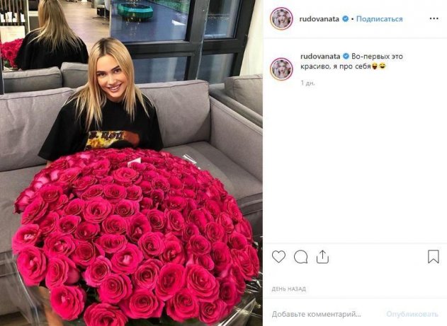Такое количество цветов можно назвать вложением бессмысленным (розы быстро вянут, от них ничего кроме мусора не остается) и очень дорогим вложением средств, а из этого можно предположить, что предполагаемый любовник Рудовой любит сорить деньгами. Судя по всему, за розы тот небедный мужчина «покупает» признательность своенравной актрисы, задаривает ее огромными букетами, чтобы та не избегала хотя бы встречи с ним. Впрочем, о какой-либо благодарности богатый кавалер актрисы может только мечтать – даже под фото с цветами Наталья не удержалась от того, чтобы похвалить себя и только себя.