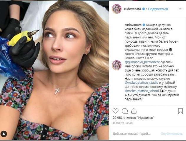 Недавно Наталья Рудова опубликовала новую запись в своем микро-блоге и похвасталась, что «открыла» для себя качественный косметический салон. Именно там она сделала перманентный макияж бровей, и теперь всем будет рекомендовать это место. Занятно, ведь раньше актриса постоянно обслуживала в салоне своей подружки Анастасии Решетовой. Интересно, почему в этот раз она «предала» Настю и не захотела сделать эти процедуры у нее.