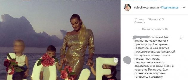 На одной из фан-страниц Анастасии высказал своё мнение пользователь, представившийся экстрасенсом. Эксперт раскрыл серьёзную угрозу жизни Волочковой и настоял на том, что балерине нужно срочно возвращаться домой: «Анастасия! Как эксперт по белой магии и практикующий экстрасенс настоятельно Вам советую поскорее возвращаться домой! Эти травмы, пожар, плохая погода - неспроста. Недоброжелательница обратилась к чёрным силам и навела на Вас порчу. Если останетесь на острове - готовьтесь к худшему».