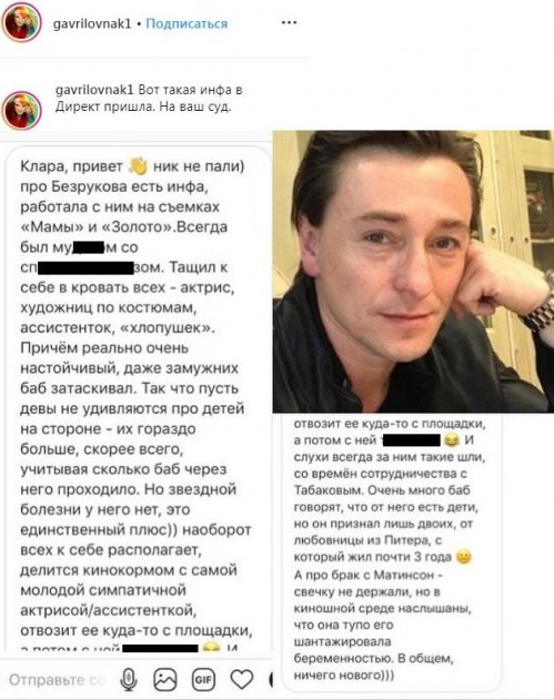 Одна из страниц в социальной сети Instagram постоянно выкладывает скандальные новости о российских звездах. Из-за того, что она стала достаточно популярной, некоторые люди, которые по их словам владеют достоверной информацией, присылают различные истории. Обычно это тайны знаменитостей, о которых знают только единицы. Так и произошло на этот раз. Коллега актера Сергея Безрукова (как она сама представилась) рассказала о его «блудной» жизни. По словам женщины, она присутствовала на съемочной площадке фильмов «Мама» и «Золото», поэтому воочию видела непристойное поведение артиста и его постоянный флирт с женщинами.