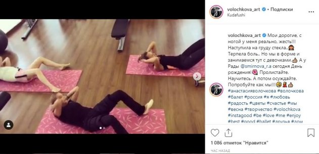 По всей видимости, балерина действительно сильно поранилась. Сообщение сопровождалось видеозаписью, на которой было запечатлено, как она вместе с другими девушками занимается спортом. Тем не менее, если обычно она делает растяжку из положения стоя, то в этот раз она выполняла все упражнения, лежа на коврике. Скорее всего, с такой травмой она даже не может нормально ходить.