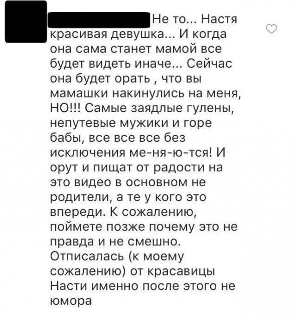 Неодобрение высказывали по большей части молодые мамы, которых и высмеивала звезда «Универа». На оскорбительные комментарии недовольных «мамочек» Настасья отвечала взаимной руганью, из-за чего под постами с «матьМиланки» возникала настоящая буча.