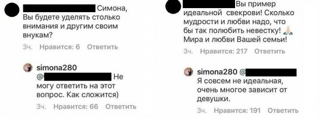 Кроме того, мать Тимати снова «подколола» Решетову, ведь когда поклонники спросили, будет ли Симона любить всех своих внуков одинаково, Юнусова написала: «Не могу ответить на этот вопрос». Поведение матери Тимати может сигнализировать о том, что она намекает Решетовой, что та должна больше стараться, должна угождать свекрови и дружить с ней, если хочет к себе того же отношения.