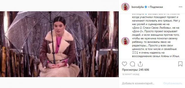 После постоянного общественного давления на Ларченко, упреков со стороны семьи Рапунцель и других участников шоу, девушка вынуждена была уйти с проекта. Но теперь в своем блоге она не стесняется говорить правду о том, что происходило в «Доме-2», а также пересказывает слухи, которые ей удалось услышать. Казалось бы, это заслуженная сатисфакция Марго за то, что ее выгнали фактически ни за что, но Бородина не успокаивается – теперь она устроила полноценную травлю Ларченко из «Дом-2», натравив своих подписчиков на девушку.
