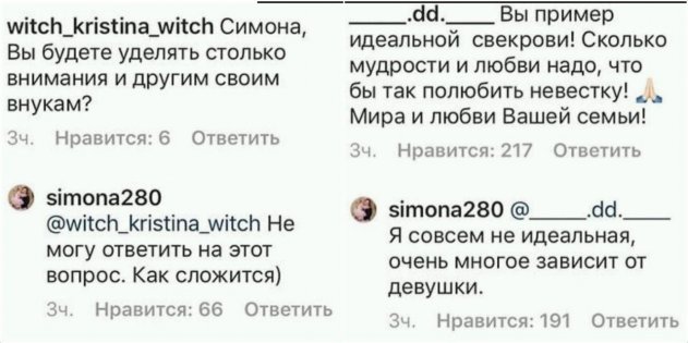«Сколько мудрости и любви надо, чтобы так полюбить невестку! Мира и любви Вашей семье!», — говорят ей неравнодушные пользователи.