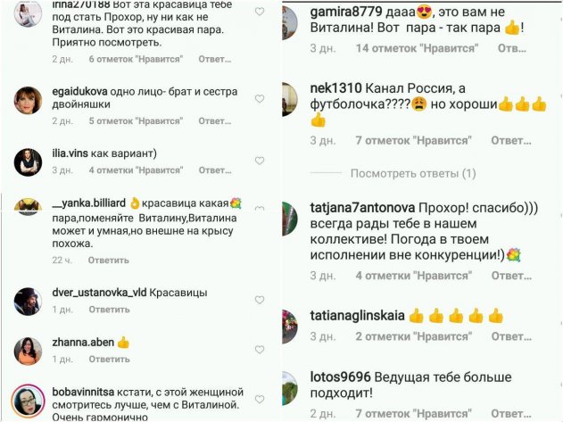 Многие пользователи отмечают, что Татьяна подходит Прохору больше, так сказать величию под стать. А вот Виталина рядом с ним, как «колхозная девочка», в ней нет столько пафоса и стервозности – что однозначно мешает их совместной личной жизни. Кроме того, в сети появилась информация, что в последнее время пара вовсе и не живет вместе. Прохор большую часть времени уделяет своему новому проекту «Погода», в качестве телеведущего, а Виталина безуспешно пытается создать «атмосферу» для дальнейшей беременности от Прохора.