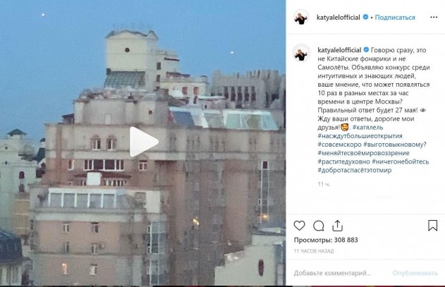 В своем микроблоге популярная певица Катя Лель поделилась со своими подписчиками видео с неопознанными летающими объектами. Это уже не первая встреча исполнительницы с внеземной цивилизацией. Несколько недель назад Катя уже публиковала подобное видео, но снято оно было в Кисловодске. Теперь певицу преследуют неопознанные объекты уже и в Москве. Катя отметила, что объекты на видео не китайские фонарики или самолеты. А так же она призвала людей, которые знают что это может быть, озвучить свое мнение.