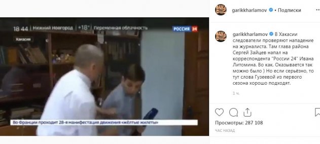 Не так давно в Сети стали обсуждать инцидент, произошедший в Хакасии. Там глава района Сергей Зайцев напал на корреспондента «России 24» Ивана Литомина. Сейчас правоохранительные органы занимаются расследованием, а некоторые звезды выставляют тематические посты на этот счет. Так, Гарик Харламов посчитал остроумным опубликовать на своей странице в Instagram-аккаунте отрывок из этой драки, добавив музыку из игры-боевика. К тому же, он не забыл и в этой ситуации «приплести» Ларису Гузееву и всем известную ее фразу. Комик, может быть, потерял страх, раз так открыто использует для своих насмешек материалы федерального телеканала?