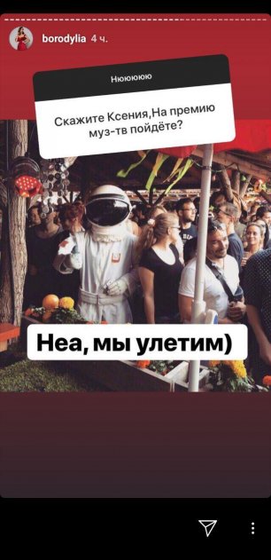 А в данный момент, Бородина проговорилась, что на период премии Муз-ТВ ни улетают всей семьей, само мероприятие назначено на 7 июня. А может быть ее просто не пригласили на светское мероприятие, так как никакого отношения к творчеству она не имеет, либо девушка запланировала следующий отпуск на шикарном курорте, который стал возможен благодаря рекламе сомнительных товаров в своем профиле. Видимо, зубная реклама все-таки приносит свои плоды, как ее публикуют на аудиторию почти в 13 миллионов человек.