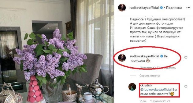 «Вы молодец», – написала Рудковская к своему посту. Поклонники уличили продюсера в комментариях самой себе и посчитали, что она просто забыла переключить аккаунт и случайно опубликовала его со своего официального Instagram-аккаунта. Похвала самой себе вызвала бурную реакцию фолловеров.