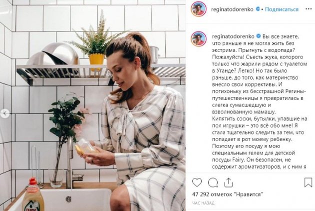 Несколько месяцев назад в паре Регины Тодоренко и Влада Топалова родился первенец, которого назвали Михаилом. После этого жизнь телеведущей значительно поменялась, и она не устает говорить об этом практически в каждой записи в Instagram-аккаунте. На этот раз артистка обратила внимание на то, что из-за материнства ей пришлось «завязать» с путешествиями и экстримом. До рождения сына она была ведущей программы «Орел и решка», побывала практически в каждом уголке мира и делала сумасшедшие вещи. Но это в прошлом. Ребенок забирает слишком много времени, требует постоянного внимания и, видимо, постепенно становится для звезды бременем. По крайней мере, она «превратилась в слегка сумасшедшую и взволнованную мамашу», как сама это утверждает без стеснений.