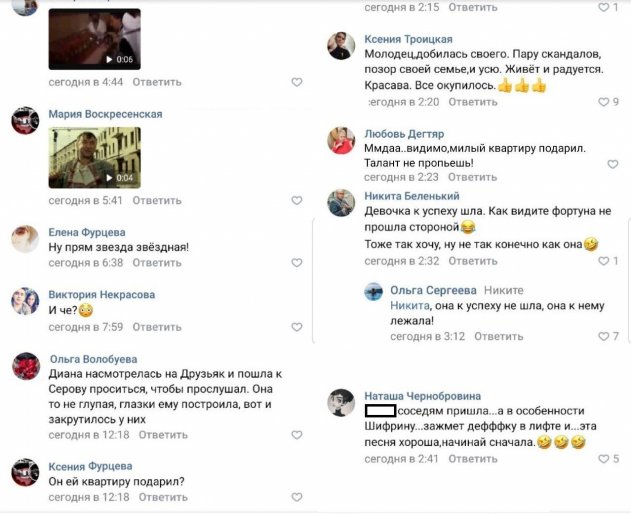 «Диана насмотрелась на Друзьяк и пошла к Серову проситься, чтобы прослушал. Она то не глупая, глазки ему построила, вот и закрутилось у них», «Он ей квартиру подарил?», «Мдаа..Видимо милый квартиру подарил. Талант не пропьешь!», - пишут пользователи в сети.
