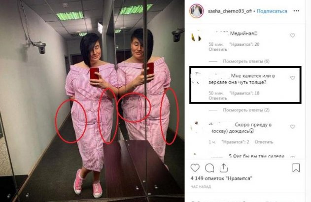 И всё бы ничего, вот только зеркало «подвело» участницу телестройки и Саша лишь опозорилась провальным фотошопом на снимке. Вероятно, в погоне за идеальными пропорциями молодая красавица забыла скорректировать формы в отблеске. Ведь на снимке отчётливо заметно, как отражение буквально в два раза превышает объёмы Черно, нежели в реальном силуэте. К тому же, примечательным стала и неудачная обработка складок девушки в районе бёдер и второго подбородка, которых и вовсе нет на левой части снимка. Вероятно, на фоне комплексов Черно уже буквально помешана на идеальных параметрах, однако, таким образом Саша лишь усугубляет ситуацию, выставляя себя на посмешище.