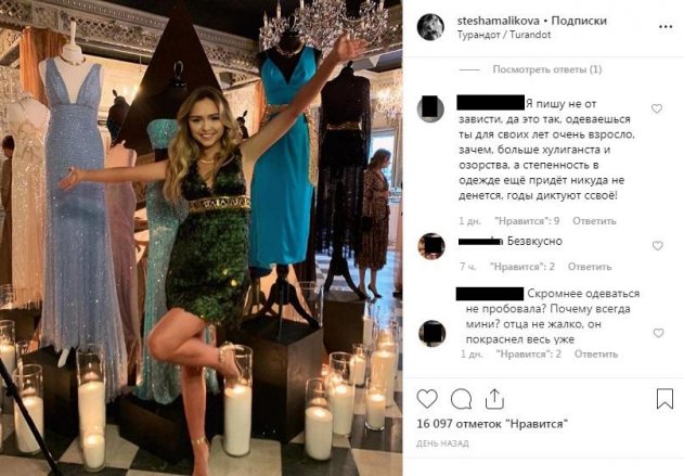 Как оказалось, Стеша снова возмутила некоторых хейтеров своим мини-платьем изумрудного цвета. В комментариях пользователи писали, что девушка практически всегда выбирает короткие наряды и одевается совсем не по возрасту, чем может только позорить знаменитого отца. Сама Стефания на критику хейтеров не отвечает.