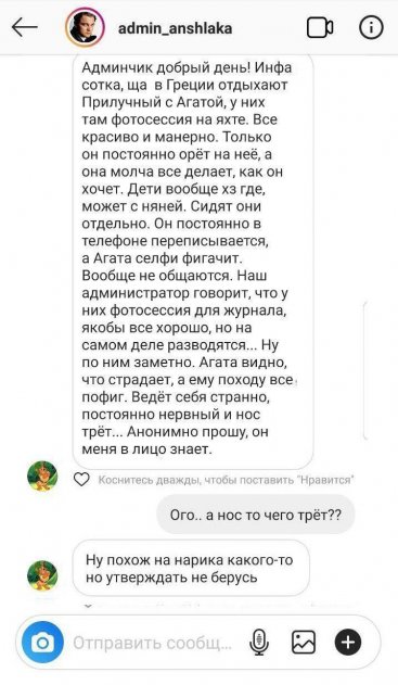 Инсайдеры уверяют, что отношения актёров очень быстро сходит на нет. Недавно они были замечены на острове Крит в отеле Abaton Island Resort & Spa, где у них проходила романтическая фотосессия для журнала «GQ». Если верить анонимному источнику, то Павел постоянно кричал на Агату и не обращал на неё должного внимания, а она молча терпела.