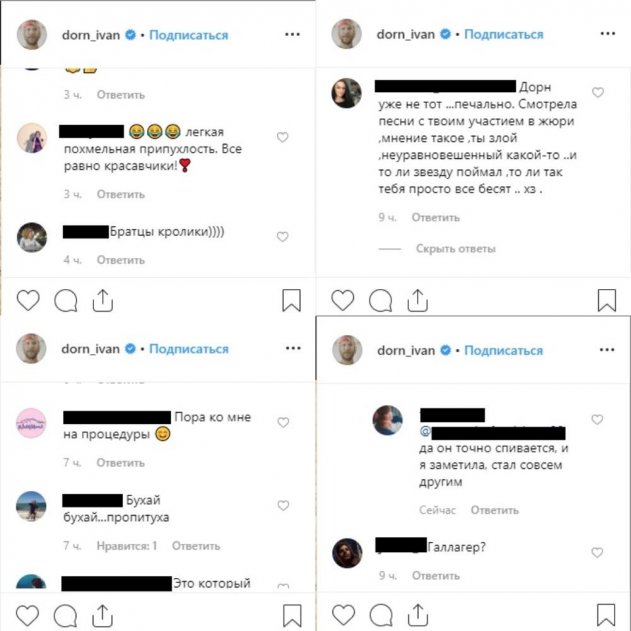По мнению других, «алкогольная зависимость» повлияла и на поведение Ивана: «Дорн уже не тот… Печально. Смотрела „Песни“ с твоим участием в жюри, мнение такое, ты злой, неуравновешенный какой-то», «Да он точно спивается, и я заметила, стал совсем другим».