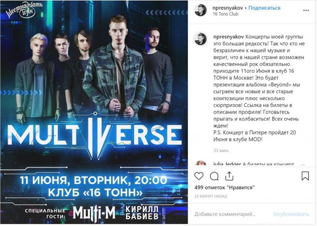 Никита Пресняков сын Владимира Преснякова и Кристины Орбакайте, объявил своим подписчикам в Instagram о предстоящем концерте его группы, а также пригласил всех небезразличных к их музыке приобретать билеты на концерт. Он отметил, что их концерты большая редкость, и действительно, последний концерт группа MULTIVERSE давала еще в 2017 году. Что послужило возобновить концертную деятельность коллектива неизвестно. Возможно, Пугачева выкинула из гнезда, и Никите потребовалось самому искать варианты, чтобы обеспечить себя и свою супругу фотомодель Алёну Краснову, ведь совсем недавно Никита весьма скромно отпраздновал свой 28 день рождения.