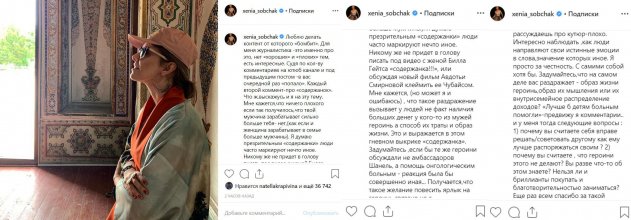 По мнению Собчак, слово «содержанки» многие трактуют неправильно – большинство презрительно относятся к таким женщинам и уверены. Раздражение больше вызывает не сам факт наличия денег у мужей и их жен, а образ жизни супругов, а также способ траты финансов, уверена Ксения. Ведущая решила заступиться за «содержанок». В своем посте Собчак намекнула, что никто не имеет права решать, как другому распоряжаться своим. К тому же, пользователи возмущаются тем, что такие семьи живут на полную катушку, игнорируя благотворительность. В ответ на это политик заметила, что, если человек покупает бриллианты, то это не означает, что он не занимается благотворительностью.