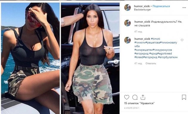 Но есть повод подозревать, что Решетова оказалась намного хитрее, чем предполагали её подписчики. Ещё в прошлом году фанаты обнаружили её невероятное стремление подражать Ким Кардашьян, копируя её образы.
