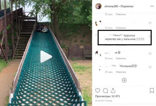 В соцсети Симона опубликовала очередной ролик с участием Алисы, где девочка играет на детской площадке. Примечательно, что 5-летняя малышка катается на горках с чрезмерно хладнокровными лицом, в то время, как мальчик поблизости буквально «извивается» от страха и эмоций. Ни для кого не секрет, дочь Тимати Алиса та ещё «бандитка». С детства девочка во всём подражает своему звёздному отцу: чёрные наряды, недетские игрушки и экстремальные развлечения.