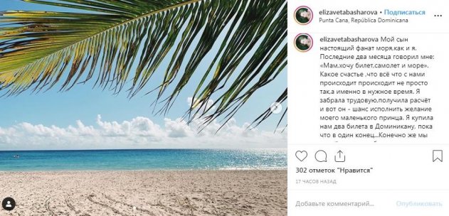 Недавно на странице Елизаветы Башаровой в социальной сети Instagram появилась запись о том, что она купила 2 билета в Доминикану. Женщина уже прилетела на острова вместе с маленьким сыном Марселем, но не знает, когда возвратится в Россию. По ее словам, ребенок давно мечтал пожить возле моря, поэтому пару месяцев на заграничном курорте им не помешает.