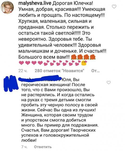 «Дорогая Юлечка! Умная, добрая, красивая! Умеющая любить и прощать. По-настоящему! Хрупкая, маленькая, сильная и преданная. Столько пережить и остаться такой светлой! Это невероятно. Здоровья тебе. Ты удивительный человек! Здоровья мальчишкам и доченьке. И счастья! Большого всем вам!», - написала Елена Малышева.