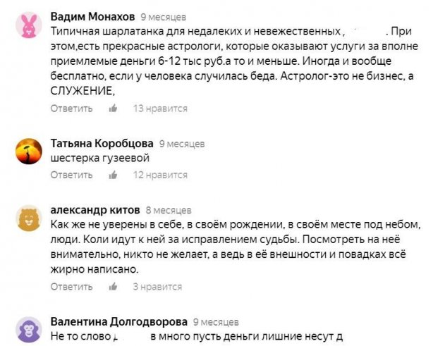«Не видитесь на аферистку Василису Володину. Это выкачивание денег за полную чушь», «Типичная шарлатанка», «Ей бы сидеть в тюрьме за обман и выкачивание денег», — возмущаются пользователи сети. Оказалось, что многие из комментаторов столкнулись с хамством и грубостью Володиной. «Не обращайтесь к ней никогда», — предупредили фолловеры желающих стать клиентами Володиной.