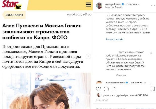 Очередной скандал назрел между двумя известными телеведущими. Андреем Малаховым и Максимом Галкиным. Конфликт произошел из-за того, что в журнале, звездным редактором которого является Малахов опубликовал заведомо ложную информацию о семье Аллы Борисовны и Максима Галкина. Речь шла о покупке звездным семейством дорогостоящей недвижимости на Кипре.