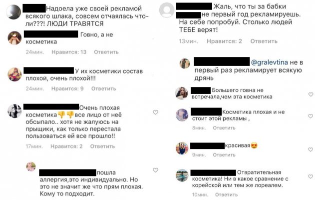 Однако пользователи заверили Бородину, что данная марка косметики имеет очень вредный и аллергичный состав, который подходит малому числу потребителей. Отчаянная, по мнению пользователей, Бородина зарабатывает на опасной косметике, из-за которой у людей развивается сильная аллергия.
