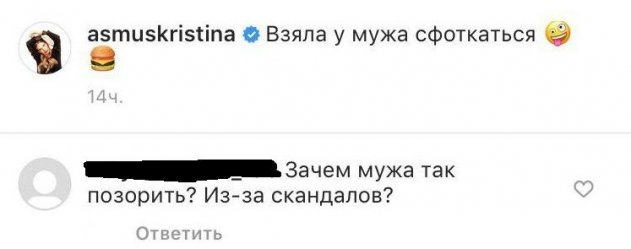Недавно жена знаменитого комика опубликовала в свой Instagram новое фото. На снимке девушка позировала с бургером, видимо, намереваясь его съесть. Судя по всему, чтобы не разочаровывать аудиторию, Асмус подписала фото, «скинув» всю вину на мужа Гарика, якобы это его бургер, а она такую пищу не употребляет. Кристина публично унизила Харламова за обжорство.