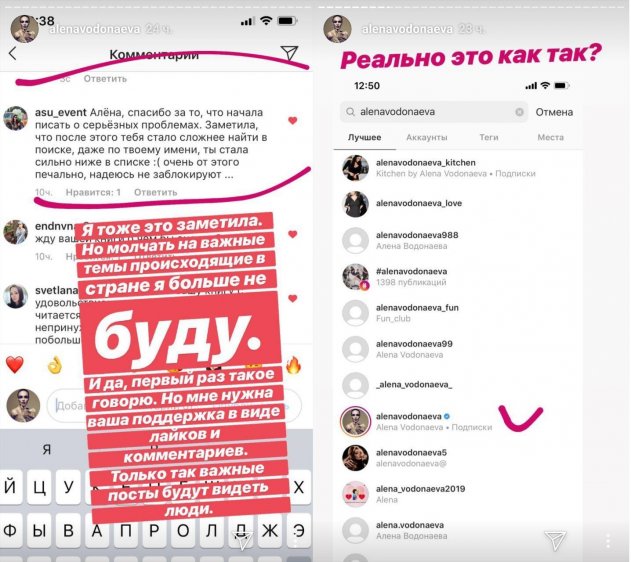 Известная телеведущая и журналист Алёна Водонаева активно ведет свой профиль в Instagram, высказывая свои мысли и взгляды на жизнь. Совсем недавно она пожаловалась, что с ней произошла неприятная ситуация и намекнула, что правительство блокирует ее Instagram. После того, как Алёна в микроблоге смело освещать разнообразные социальные проблемы страны, кремлеботы атковали правдорубку и она оказалась в теневом бане соцсети. Таким образом Instagram «наказывает» недобросовестных пользователей за какие-либо нарушения правил, которые установлены платформой. Теневой бан - исчезновение отдельных публикаций из поиска в Instagram. Так как другие интернет-пользователи не видят в ленте постов Водонаевой, то проявляют меньше активности в ее профиле, а это значит, что страница становится менее популярной и в поиске.