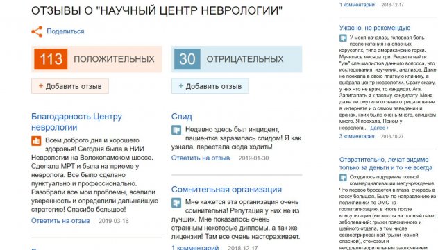 «Кормушка для узкого круга лиц», - пишут разгневанные пользователи, отмечая, что врачам наплевать на самого пациента – им важны только деньги. «Несоблюдение врачебной этики, ненадлежащее качество медицинских услуг», - так описывают московский центр неврологии побывавшие там клиенты.