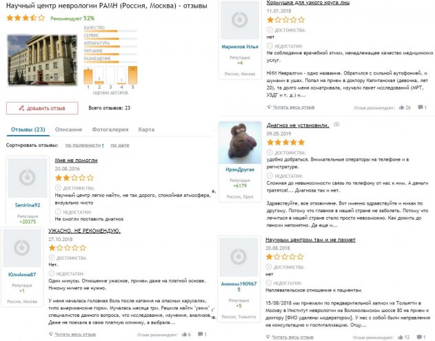 На сайтах немало положительных отзывов о научном центре неврологии, однако количество негативных комментариев, оставленных недовольными клиентами, поражает. Многие пациенты отмечают, что медики клиники не только не вылечили их, но и не смогли поставить точного диагноза.