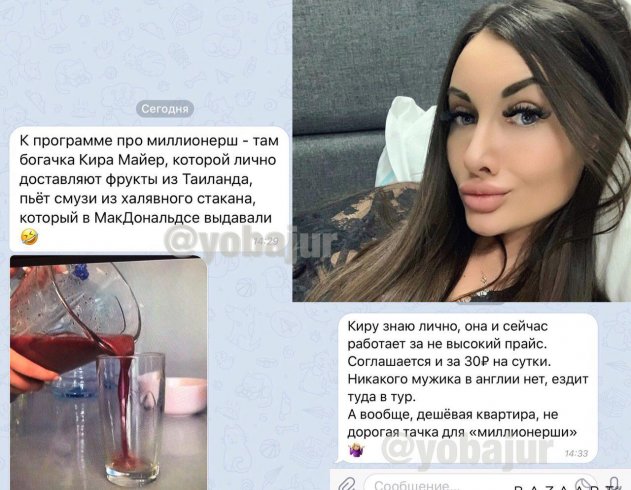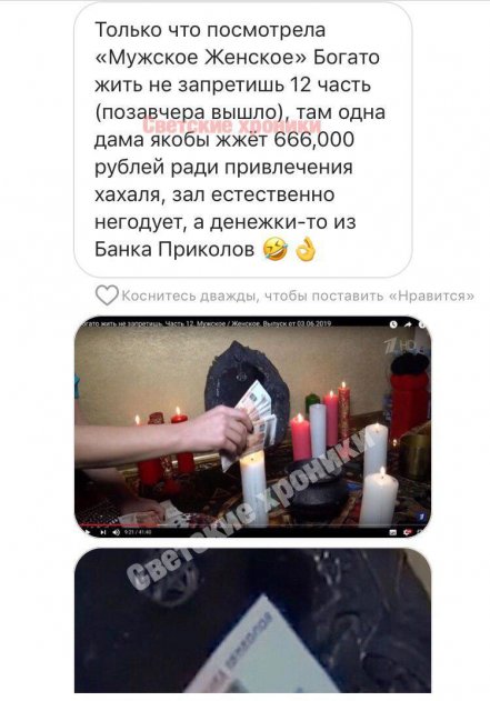 Но как оказалось, у инсайдеров свое видение на ситуацию. Так, например, показушное видео, где некая Алина Ян сжигает 666 тысяч рублей, чтобы стать счастливой на глазах у ведуньи – всего лишь пятитысячные купюры банка приколов. А история вымышлена только для программы Вторая участница Диана Коряк, по словам информаторов никакая не миллионерша. Она уроженка Донецкой области и ездит, как все обычные люди на автобусе за 11 рублей, выглядит неопрятно и дешево, но в программе рассказывает, что тратит на себе около 500 тысяч в месяц только на одежду известных брендов. Следующая участница Кира Майер – ее обвинили в оказании эскорт услуг в Москве.
