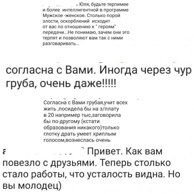 Зрители отметили, что в последнее время в эфире «Мужское/Женское» ведущая источает лишь злость, оскорбления, грубость. Гости вынуждены терпеть оскорбления от агрессивной звезды, которая «травит» их своим видением проблемы, не поддерживая и даже не сочувствуя главным героям. Так неужели за маской доброй, интеллигентной женщины всегда скрывалась агрессивная, эгоистичная личность? Поклонники отмечают, что успех не пошел Юлии на пользу, ведь живи она как большинство россиян «на 20 000 рублей в месяц» - была бы ближе к народу, и не обвиняла потерявшихся в жизни гостей в никчемности.