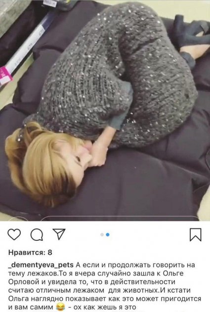 В профиле Instagram Ольги недавно засветилось новое фото. Неизвестная девушка отметила Орлову, отдыхающую на лежанке для питомцев, где телеведущая высунула язык, походя на щенка. Тем самым женщина провела ликбез на собачьем коврике. На самом деле, не особо понятно для какой цели Ольга прилегла на эту лежанку. Может хотела показать, как стать настоящей сукой?