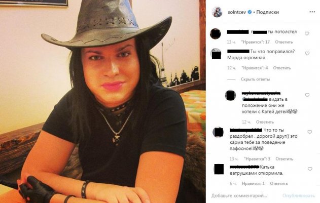 «Карма за пафосное поведение!», - заявили интернет-пользователи, которые продолжают упрекать Гогена за то, что он выставил подробности своей жизни напоказ. Однако по образу и черным волосам можно предположить, что Солнцев мог просто опубликовать одно из своих архивных фото, поскольку сейчас эпатажный артист все-таки выглядит иначе и больше не отдает предпочтение готическим образам.
