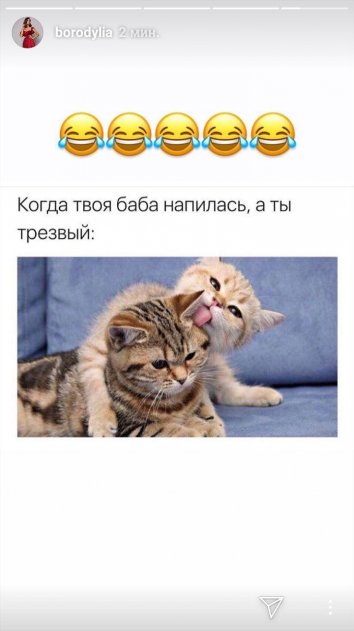 В одной из последних «сторис» Бородина необычным образом извинилась перед Омаровым за «пьяные» выходки. Она добавила картинку, где один кот интенсивно облизывает другого. Подпись к ней также была красноречивой: ««Когда твоя баба напилась, а ты трезвый».