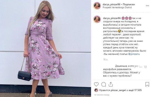 Фолловеры тут же предположили, что это аэрофобия. Вероятнее всего, что это ссоры Даши с мужем вызвали у нее проблемы с психикой и она может сказать психологическому расстройству - «привет!»