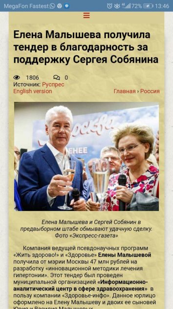 Официально тендер был дал на разработку «инновационной методики гипертонии». Деньги получило юридическое лицо, оформленное на Малышеву и ее сыновей. Ранее тендер никогда не вручался Малышевой от мэрии, но после активной агитации в своих социальных сетях и видеоролике о хорошем мэре Москвы Сергее Собянине – Елена стала счастливой обладательницей. Стоит отметить, что тендер выдается не просто так, а только путем конкурса, через полный отбор кандидатов медицинских учреждений и полной проверки законности этих организаций. Совпадение? Сумма выигранного тендера почти вдвое больше годовой выручки компании Малышевой - в 2016 году фирма заработала 23 млн, а убыток составил лишь 170 тыс. рублей.