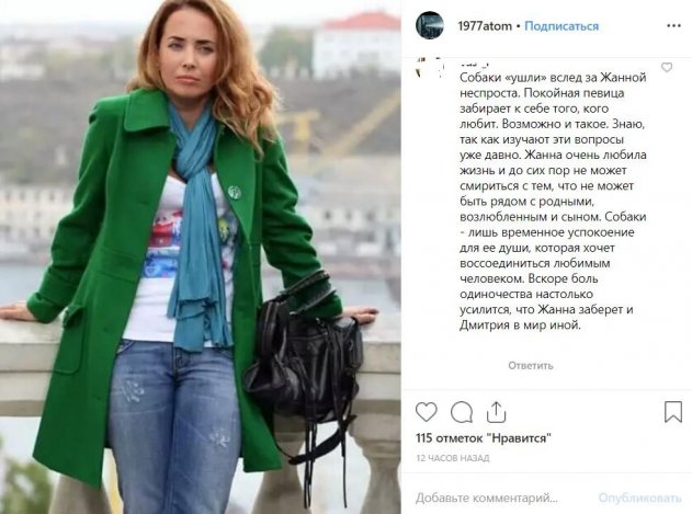 Один из сетевых медиумов, как выяснилось, полностью согласен с Наталией. Эксперт в области сверхъестественного уверен, что псы погибли неслучайно — собаки «отправились» вслед за своей хозяйкой. Жанна забирает к себе тех, кого любит, заметил медиум, так как не может смириться с преждевременным «уходом» в мир иной. Также специалист добавил, что душа певицы жаждет воссоединения с главным человеком в своей жизни — с Дмитрием Шепелевым. «Собаки — лишь временное успокоение для ее души», — заметил мистик.