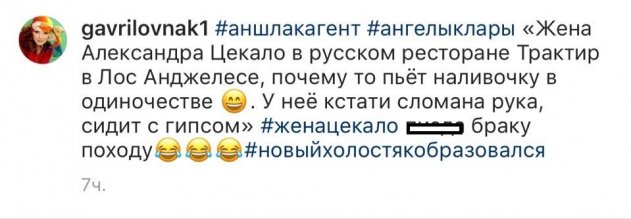 . «Жена Александра Цекало в русском ресторане Трактир в Лос-Анджелесе, почему-то пьет наливочку в одиночестве. У нее кстати сломана рука, сидит с гипсом», - сообщают свидетели.