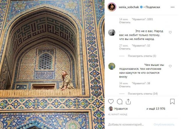 На ум сразу приходит другая цитата из художественного произведения Максима Горького «Песня о соколе», автор писал: Рожденный ползать – летать не может. Похоже, Собчак решила объяснить неприязнь народа к ней банальным сравнением себя с соколом, а хейтеров – с ужами. На это указывает также и фото, которое Ксения подобрала к посту, снимок, к слову был сделан несколько недель назад во время поездки телеведущей в Узбекистан.