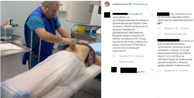 Во-первых, свои способ Елена испытала на пожилых людей. На приведенном в качестве примера ролике игры вставляют в сухожилия позвоночника неизвестной женщине преклонного возраста. По словам пользователей сети, эта процедура не сможет решить проблему. Методика нанесет более сильный вред позвоночнику, ведь вместе с болью пропадет нормальная чувствительность. Но, похоже, Малышевой старушек не жалко, поэтому приходится искать новые, не до конца проверенные способы наживы на людях.