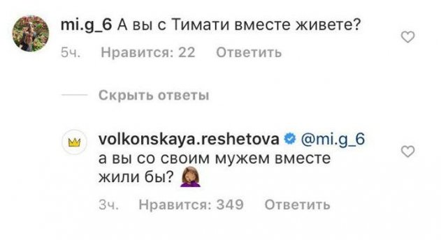 Недавно Анастасия подтвердила замужество с музыкантом. В Instagram-аккаунте Решетовой поклонники поинтересовались, живет ли модель вместе с Тимати. «А вы со своим мужем вместе жили бы?» – ответила девушка. Поклонники сразу набросились на Настю с вопросами. «А вы разве замужем?», «Вы с Тимати тайно поженились? Почему никто не знает?» – интересуются пользователи. Тут же появились фолловеры Шишковой, которые стали переживать, как данное событие скажется на ней. #Шишковаживи – такой хэштег ставят поклонники в своих социальных сетях. Впрочем, многие фанаты порадовались за Настю и поздравили ее с бракосочетанием.