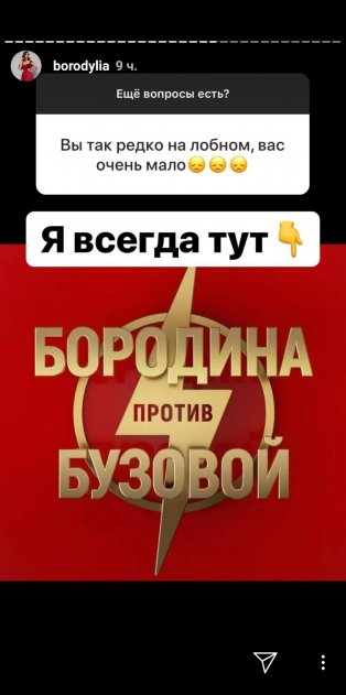 Фанаты неоднократно интересовались у Ксении через соцсеть Instagram по поводу того, почему она практически «исчезла» с эфиров «Дома-2». В недавней беседе, которую устроила в своем аккаунте Ксения, в очередной раз всплыл аналогичный вопрос. «Вы так редко на лобном, вас очень мало», — пишут фанаты. Стоит отметить, что Бородина не стала отрицать этого и лишь отметила, что она всегда находится на шоу «Бородина против Бузовой». Ранее на подобный вопрос подписчиков ведущая ответила практически также. Кроме того, Бородина пояснила поклонникам, что на Сейшелы в качестве ведущей она не ездит, так как семья не позволяет. Телеведущей попросту не нравится надолго бросать родных.